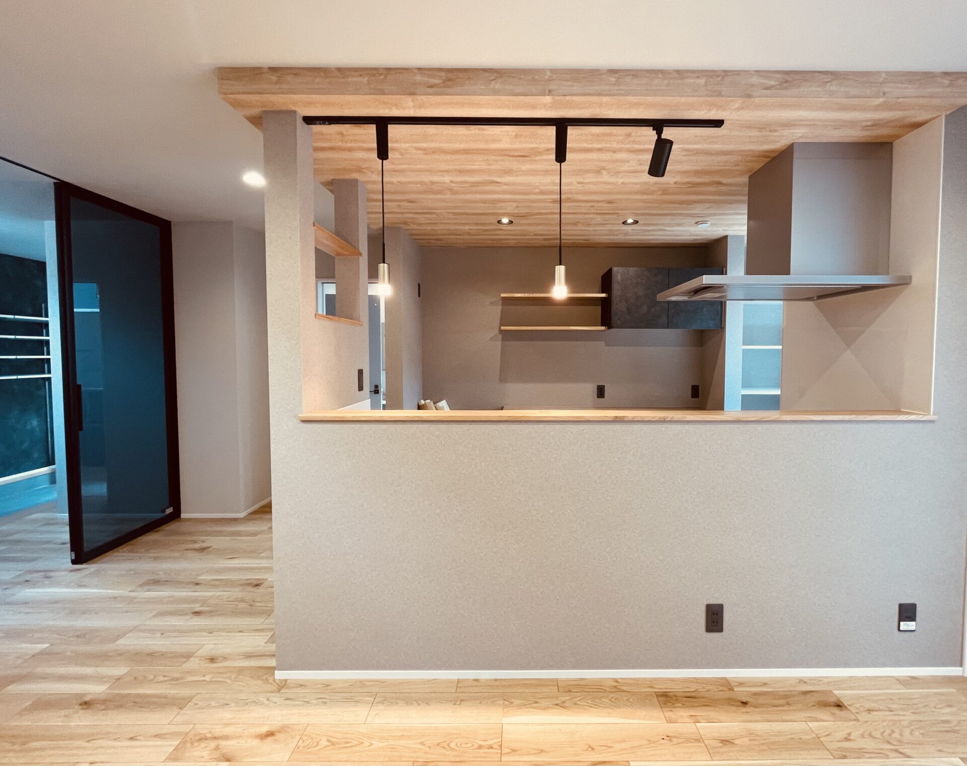 下がり天井やと壁の色にこだわってつくった奥様こだわりのカフェ風キッチン。