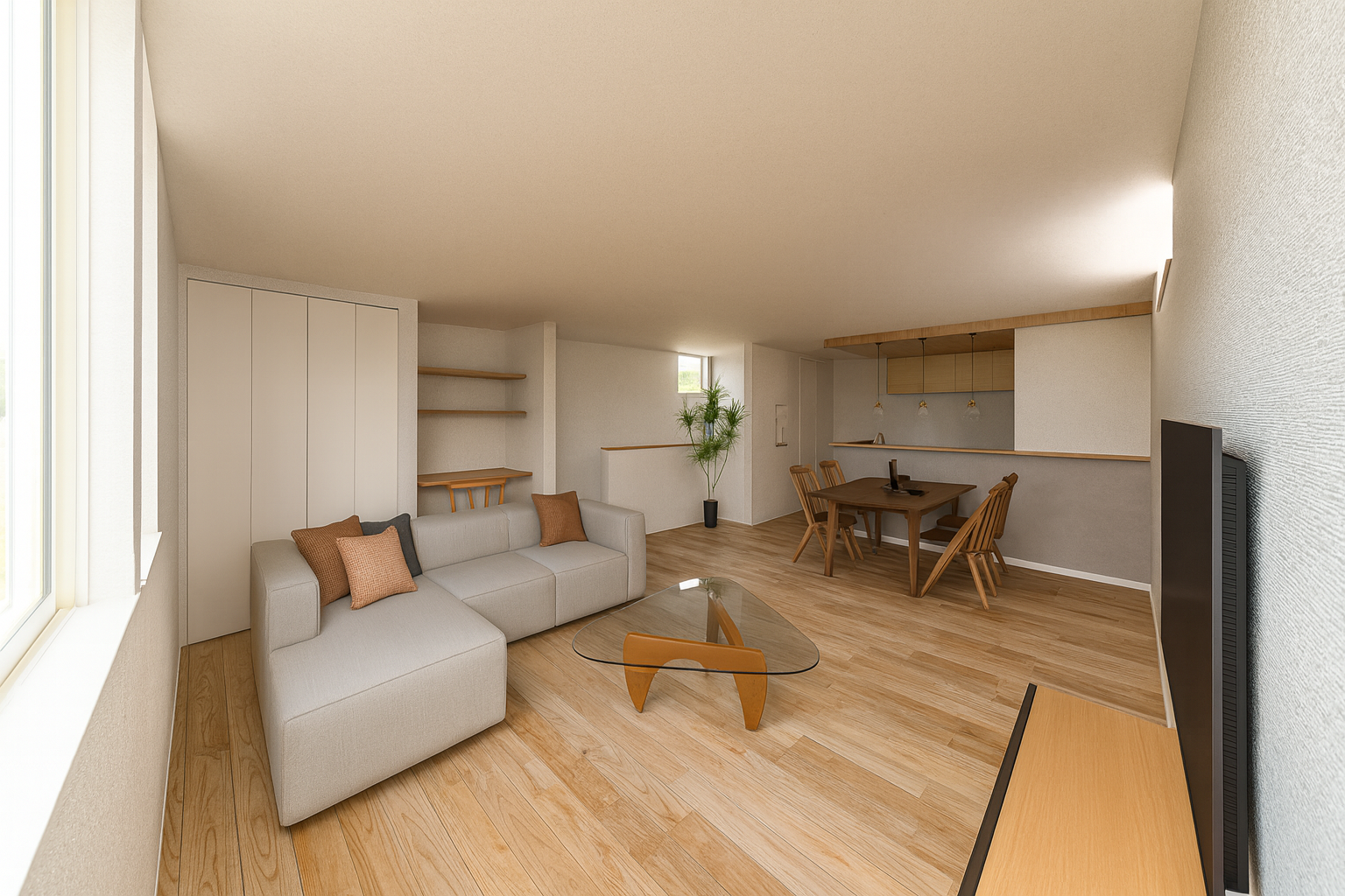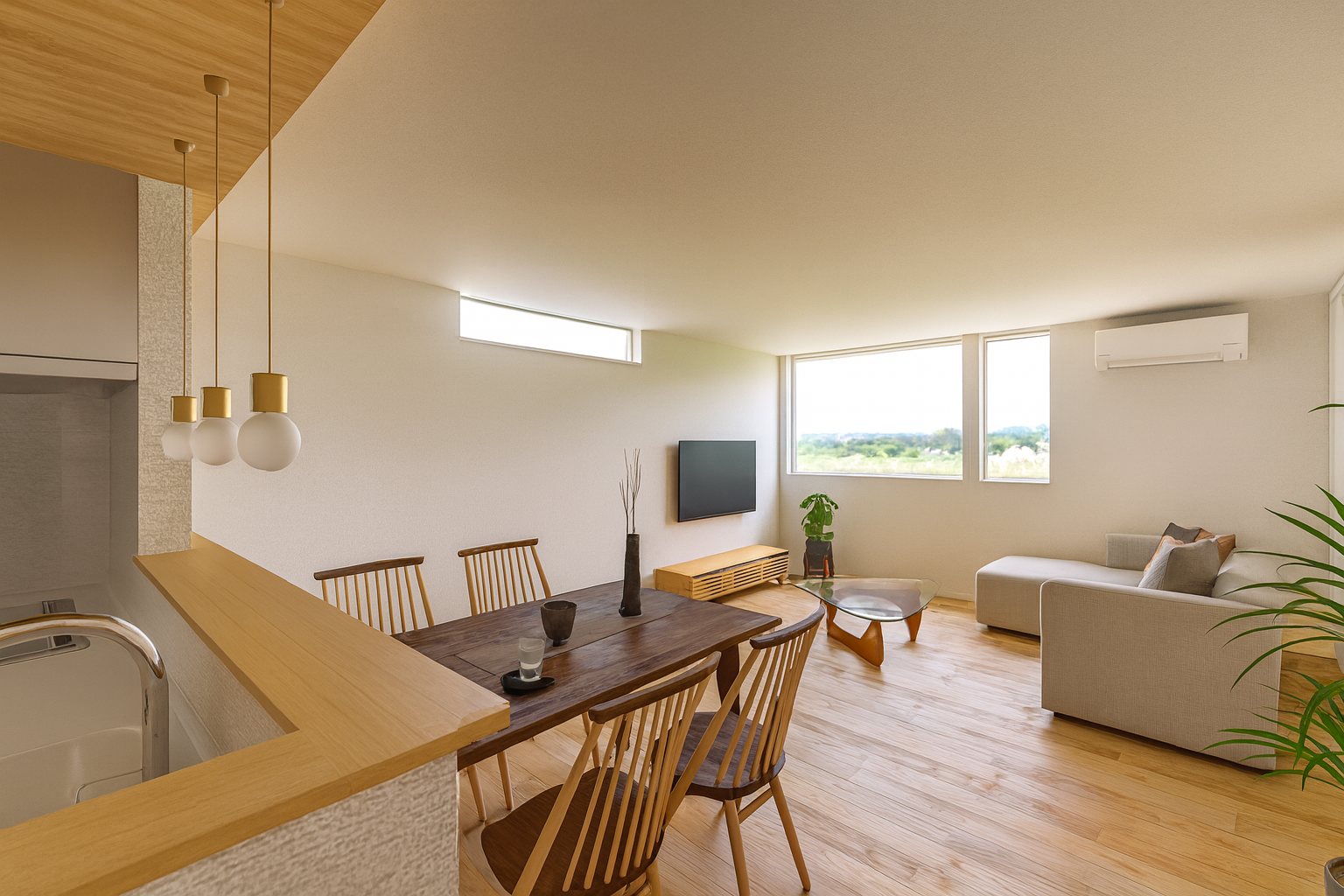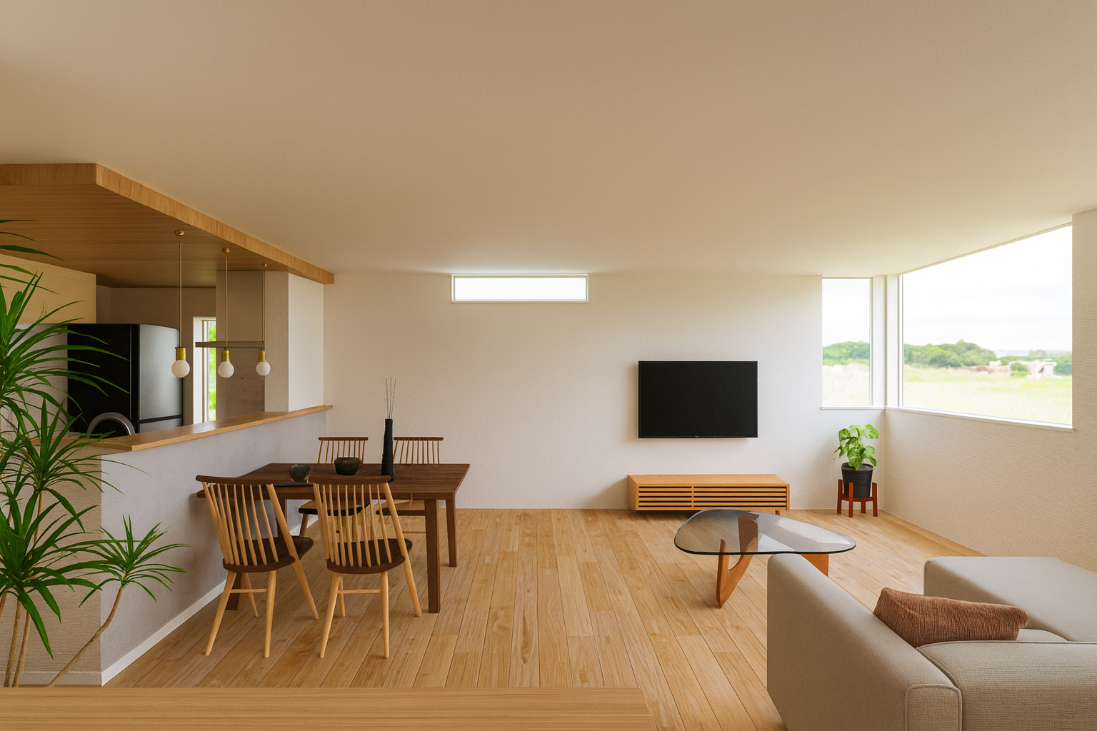 立地を生かし、名取川の土手を望むことができる明るく開放的な2階リビング。