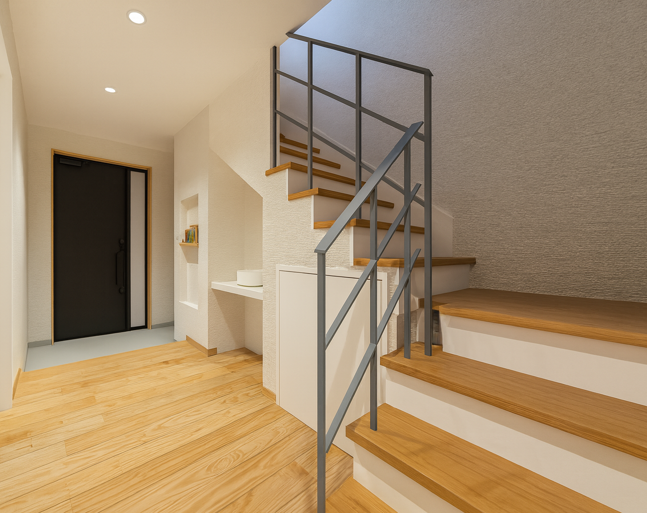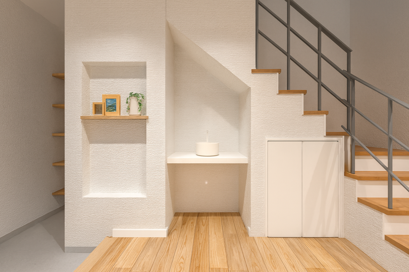 階段下をうまく活用した、玄関の手洗いコーナーで、帰宅後すぐに手洗い・うがい。