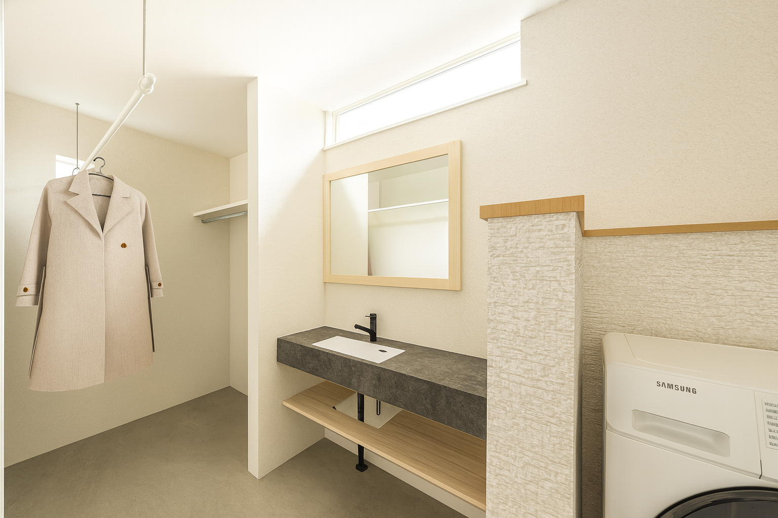 個性が光る造作の洗面化粧台と楽々家事同線のランドリースペースを一体にすることで省スペースに。