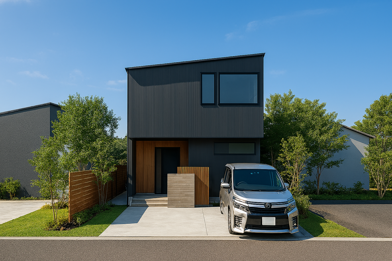 濃いグレーのガルバリウム鋼鈑の外壁材に、木調の外壁材がアクセントとなるスタイリッシュな外観。