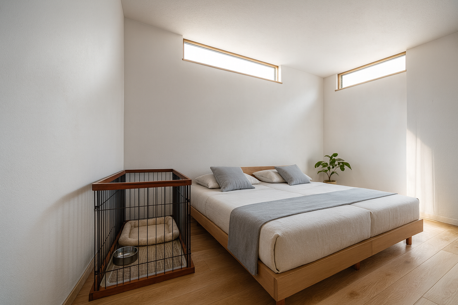 愛犬と一緒の寝室はカーテンレスの高窓仕様。