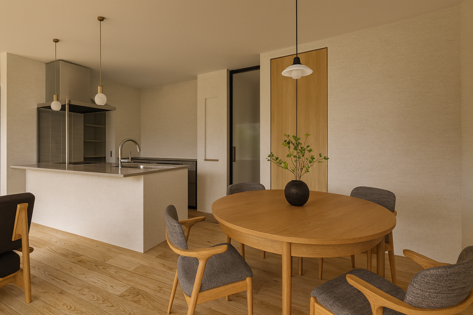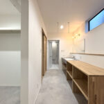 玄関を抜けると、主役のグラフテクトキッチンが静かに佇む。