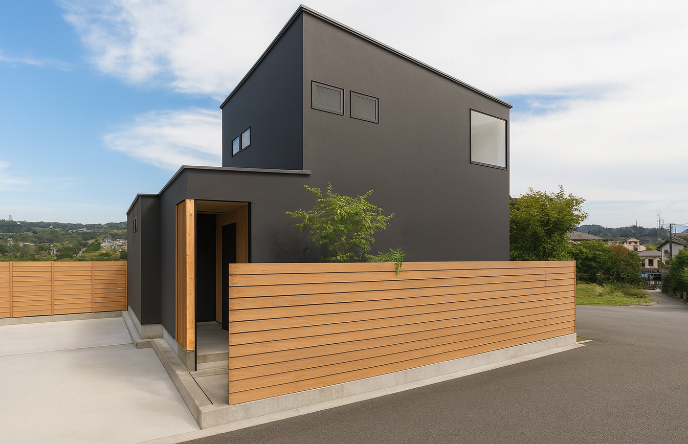 ブラックのガルバリウム鋼鈑の外壁材に、木調の外壁材がアクセントとなるスタイリッシュな外観。格子も外観に個性を与える。