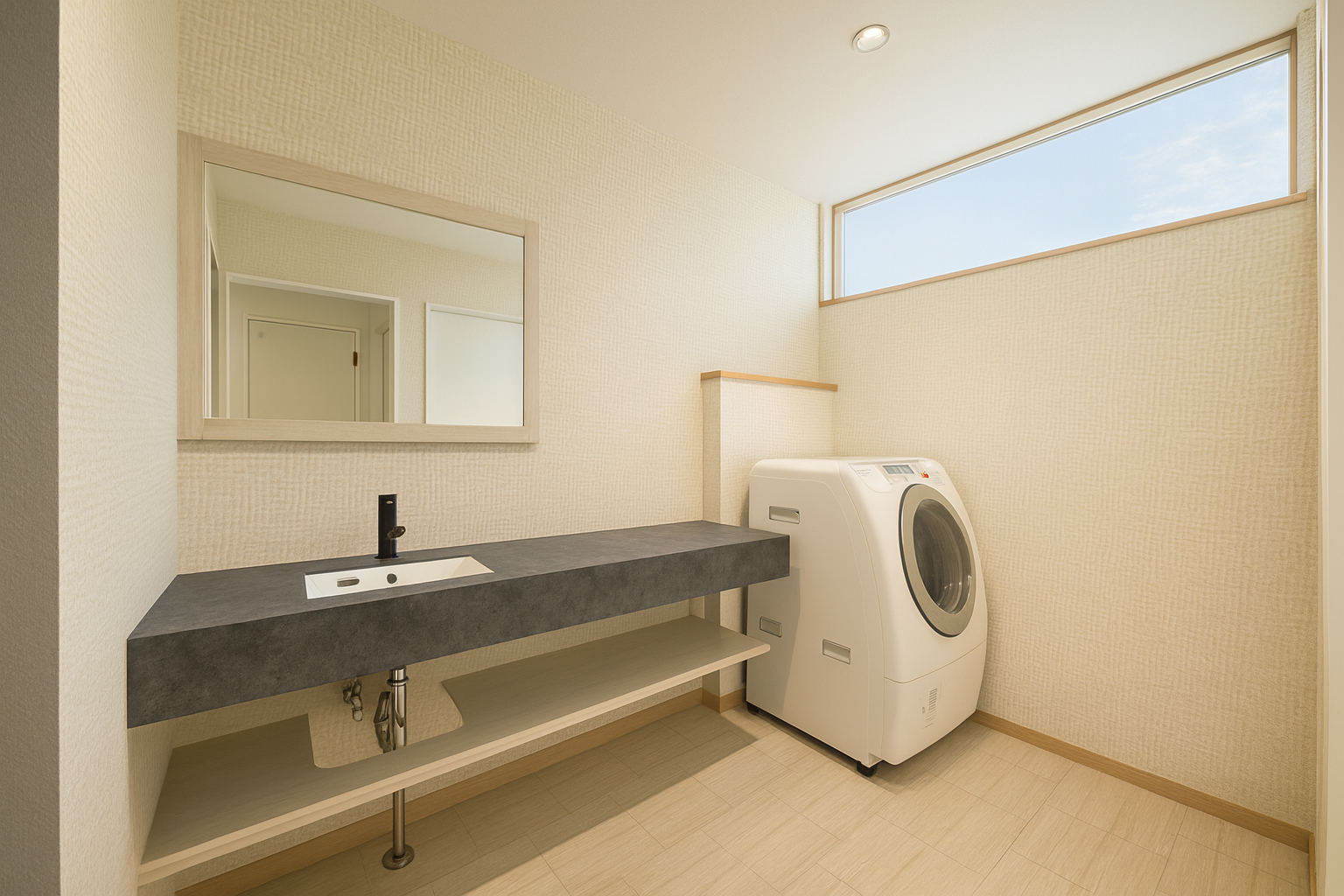 造作洗面は夫婦で並んで立っても広々。ランドリールームを兼ねたゆったりとした空間は、脱衣所と別に配置。