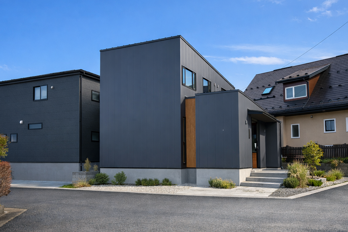 シンプルで清潔感のあるグレーのガルバリウム鋼鈑外壁材の外観がお出迎え。