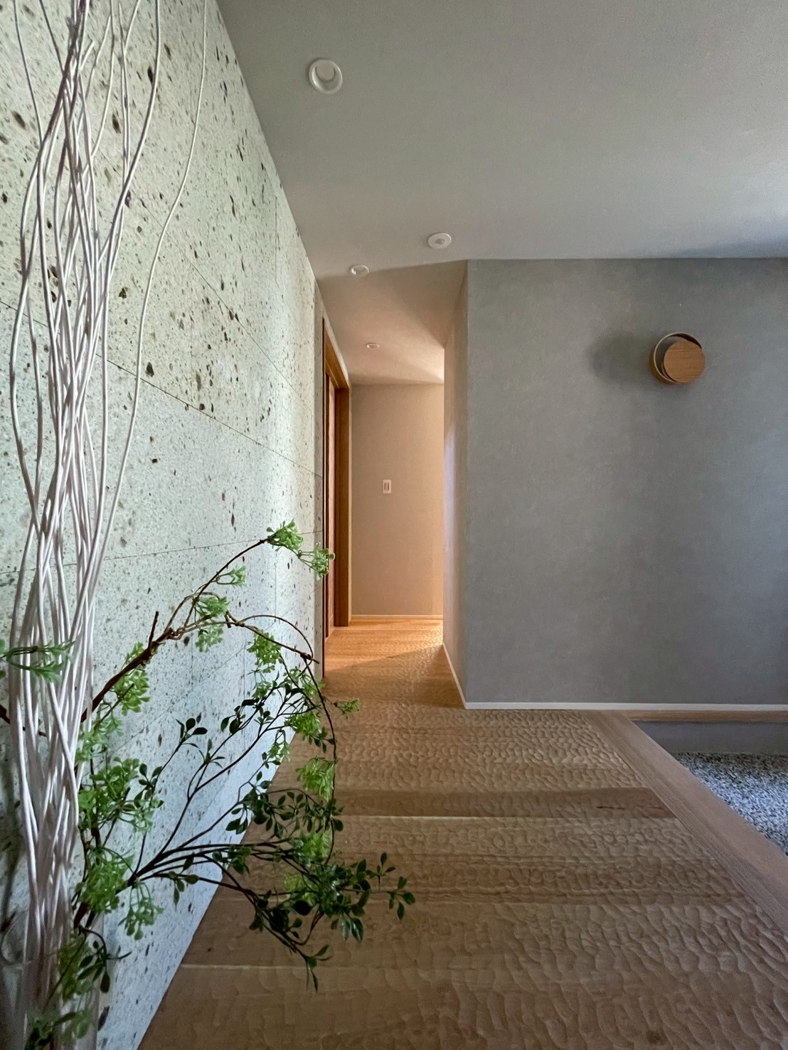 大谷石の壁+洗い出しの土間で旅館のような設えでお出迎え。