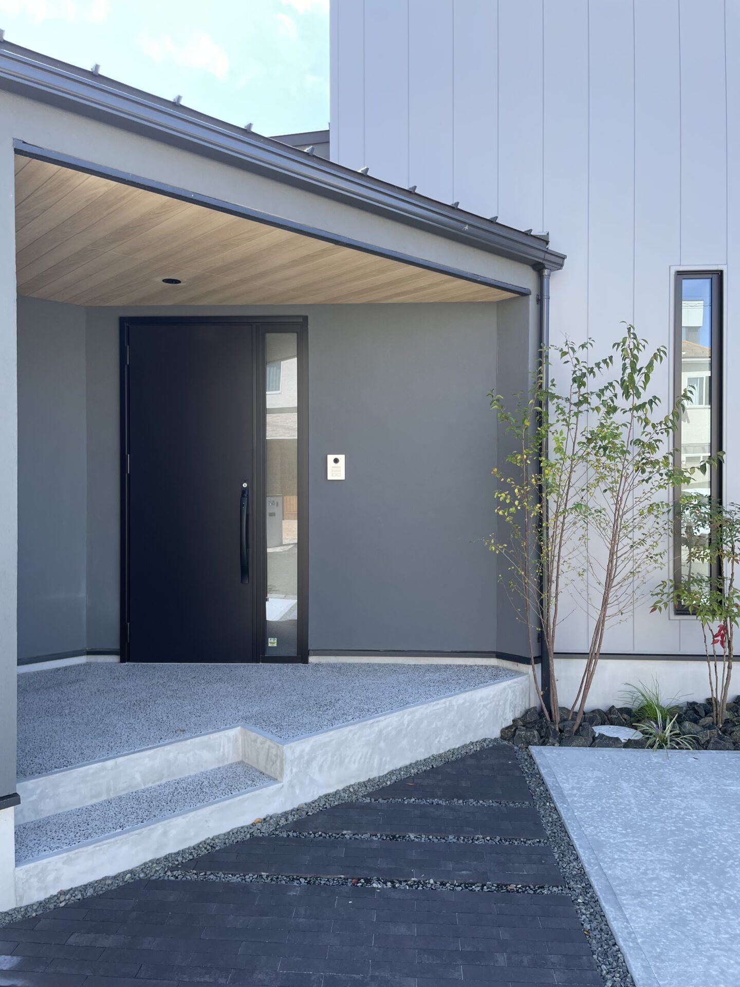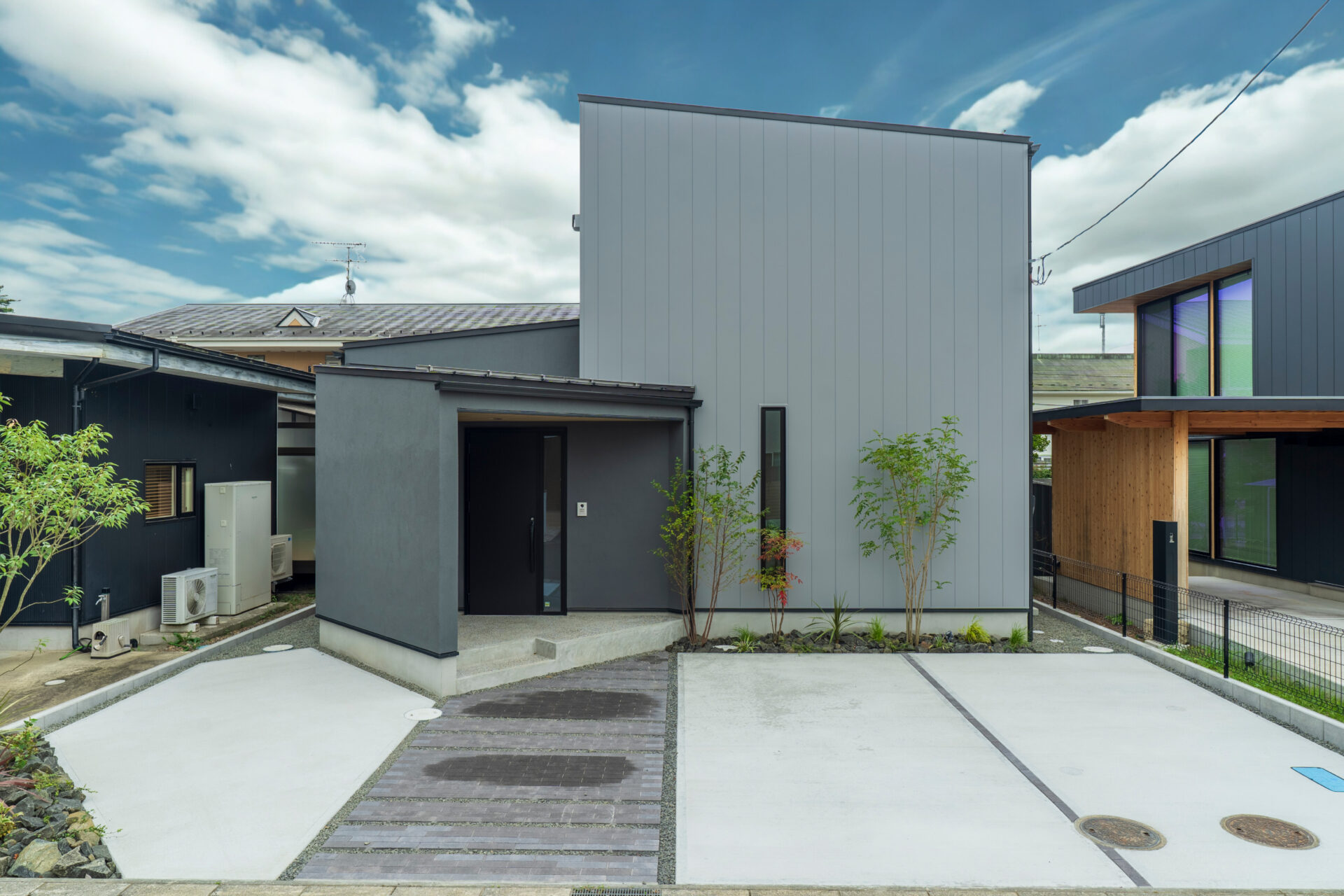 アッシュ色のガルバリウム鋼鈑外壁材に、STOの塗り壁がアクセントとなるスタイリッシュな外観。