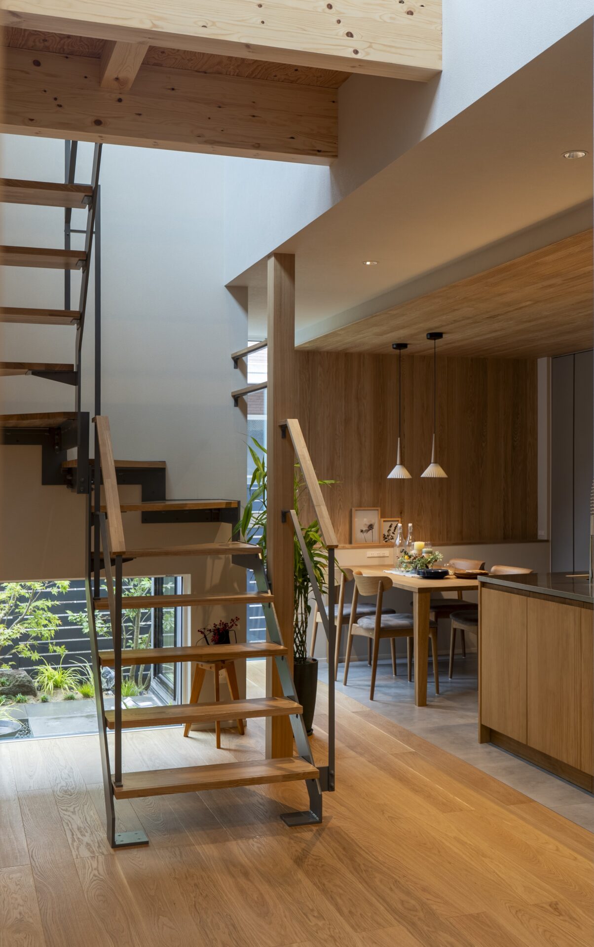 空間のアクセントとなるアイアン階段と木製扉のオープンキッチン。