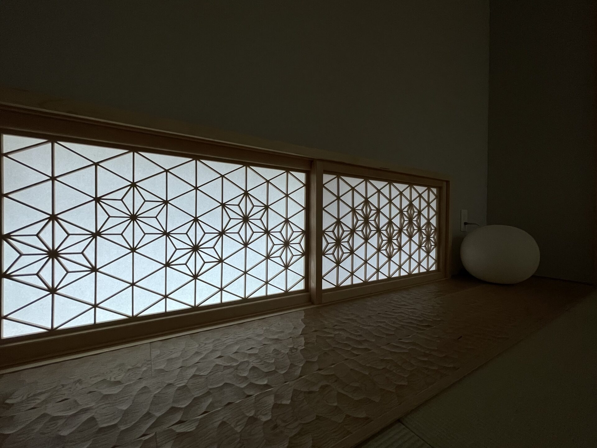 オリジナルの組子障子が空間に美しくアクセントを添える。
