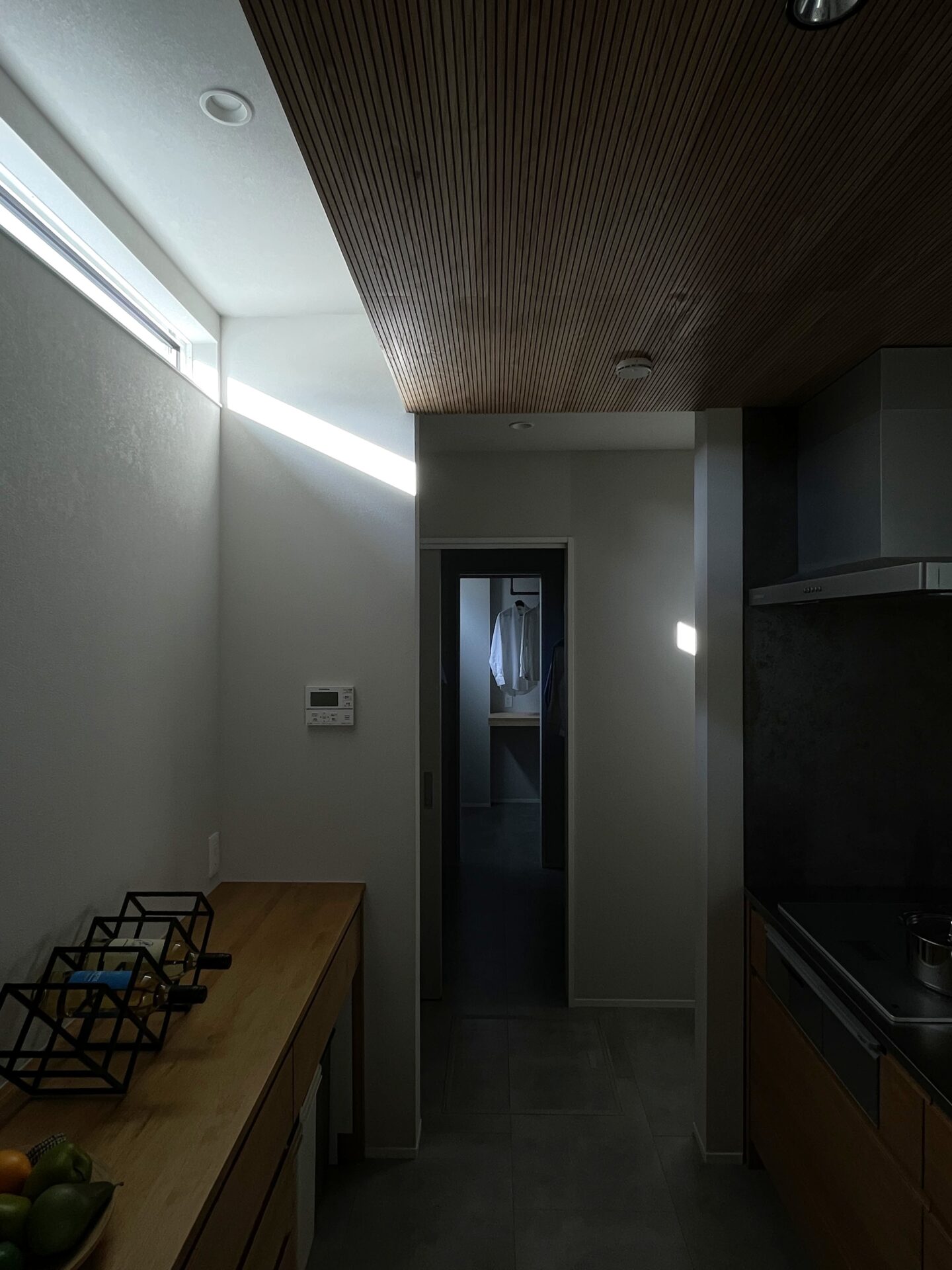 視線と陽の入りに考慮した高窓。キッチンからパントリー⇔ファミクロ⇔脱衣所⇔洗面と繋がります