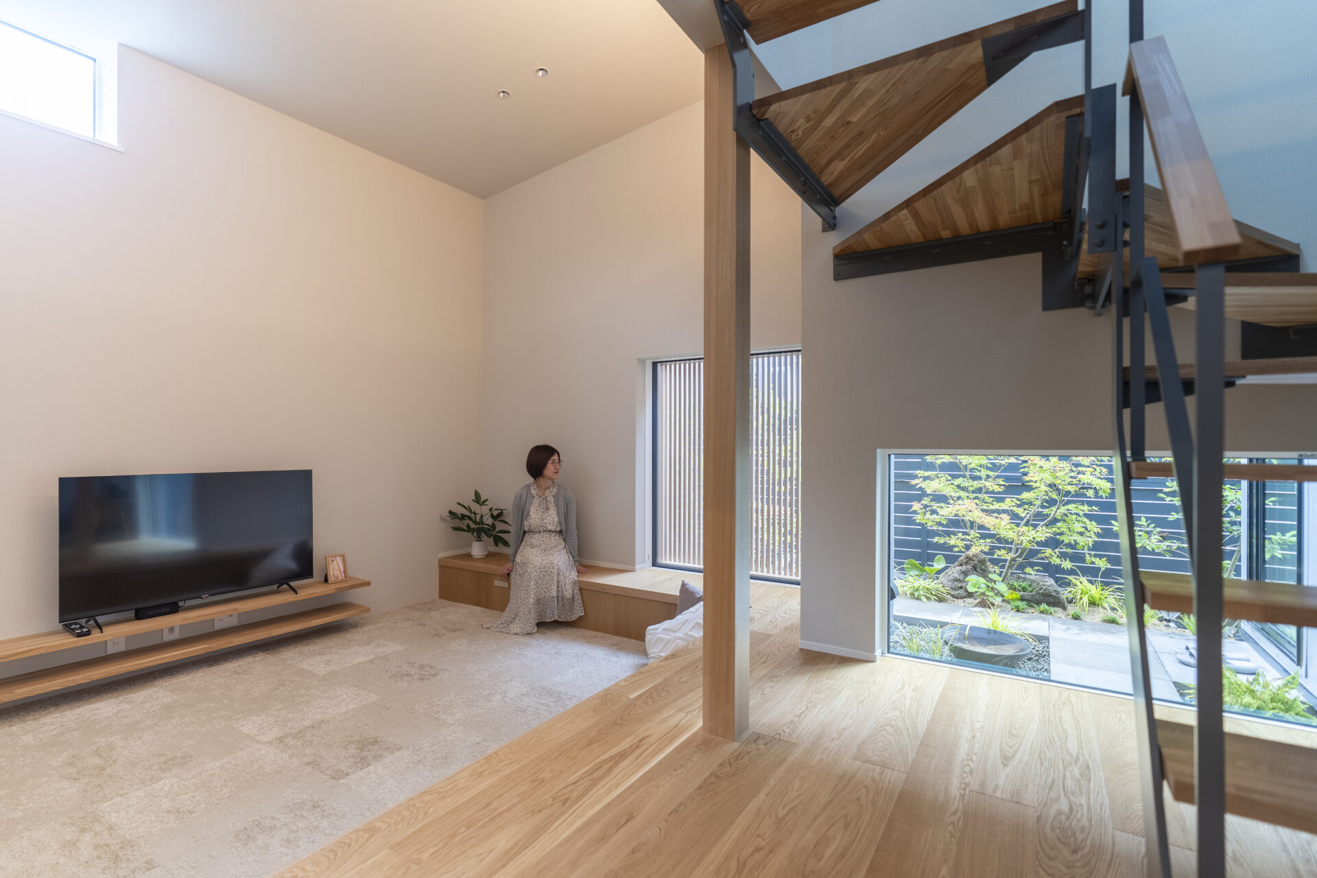 リビングはあえて床を一段下げたダウンフロアと勾配天井で、開放的なのに「おこもり感」のある空間に。