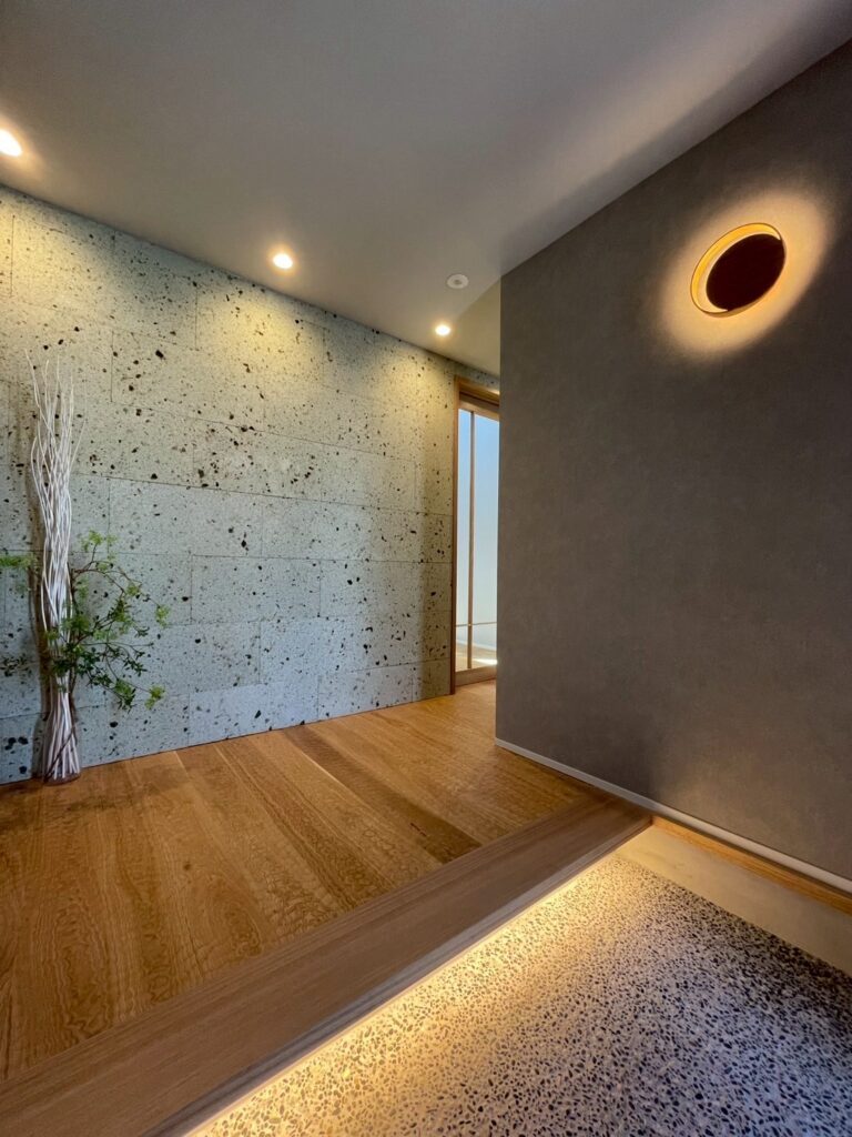 大谷石の壁+洗い出しの土間で旅館のような設えでお出迎え。