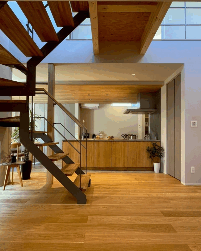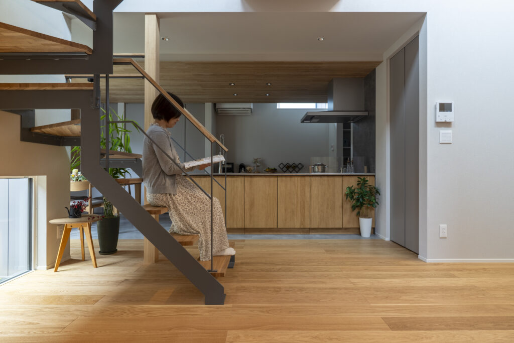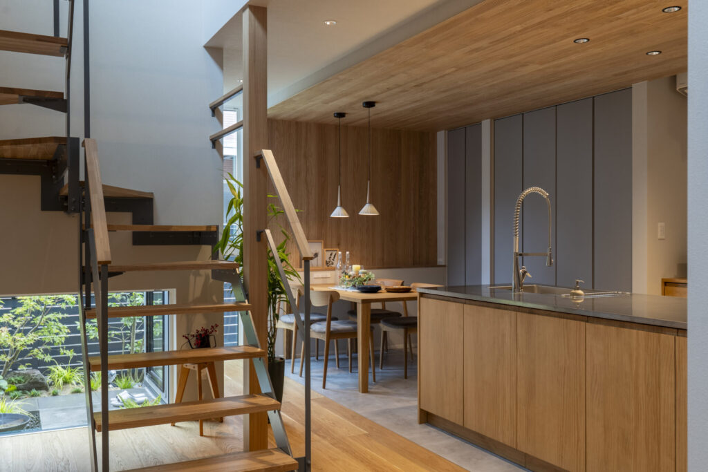空間のアクセントとなるアイアン階段と収納たっぷりな木製扉のオープンキッチン。