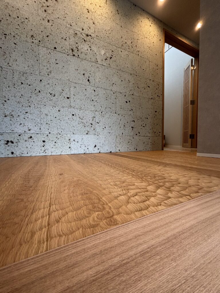 オーク材のなぐり加工が施された床の心地よい凹凸。
