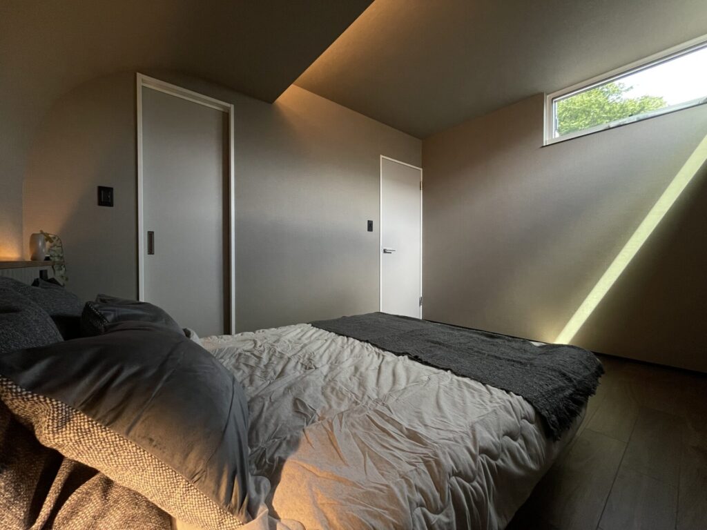アール壁と間接照明で落ち着きのある寝室。借景も取り込み、陽の入りも美しく。